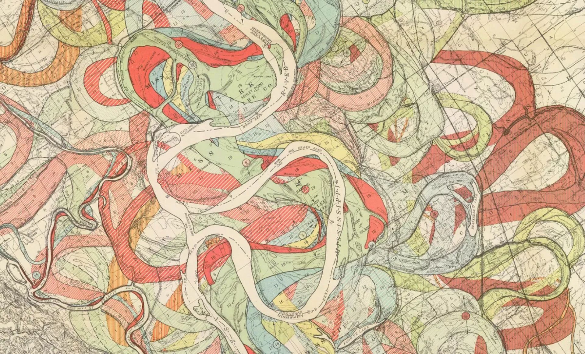 Robert Macfarlane is at his best when he presents you with an unexpected gem, a comparative historical piece to give depth and context to the broader picture. Here is his description of the “Meander Rivers” by Harold Fisk showing the shifting Mississippi River in the early 1940s: